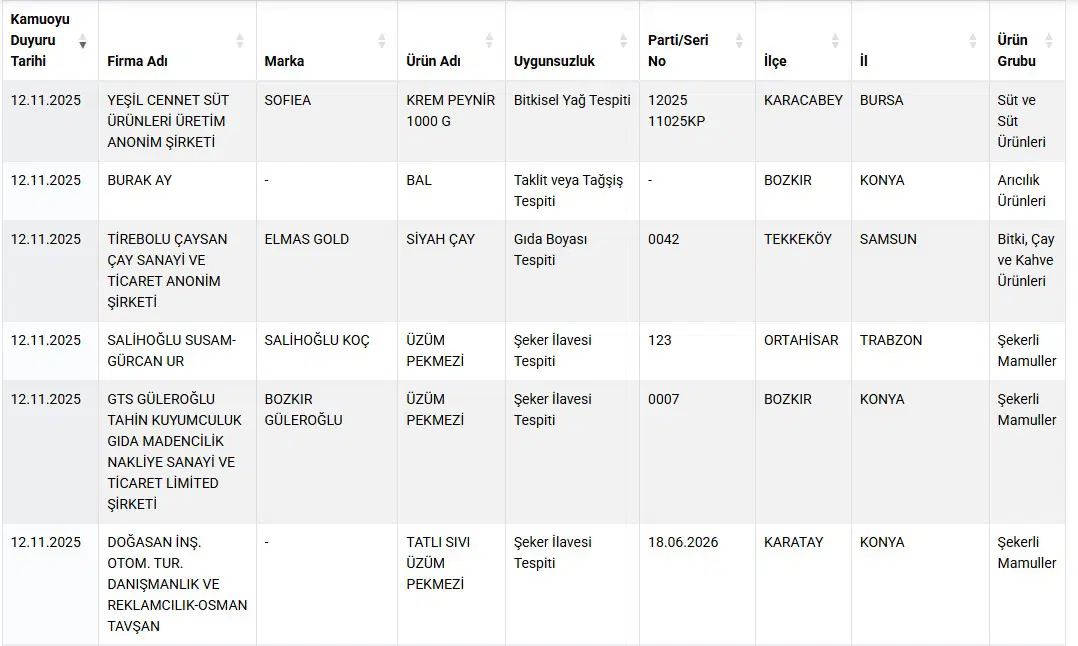 Listede pekmez, bal, siyah çay ve krem peynir gibi ürünler yer aldı. Son testlerde, bazı markaların ‘pekmez’ ibaresiyle sattığı üründe şeker olduğu, balda taklit veya tağşiş bulunduğu belirlendi.