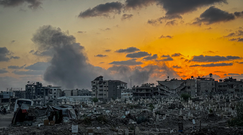 İsrail ordusunun, Gazze kentinin güneyindeki Sabra Mahallesi’ne düzenlediği saldırıların ardından bölgeden yoğun dumanlar yükseldi.