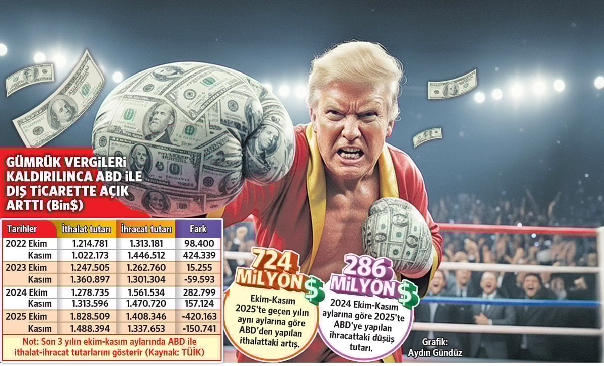 Ekim-Kasım 2025 döneminde ABD’den yapılan ithalat tutarında 724.5 milyon dolarlık artış görülürken, ihracat tutarı ise 286.2 milyon dolar azaldı.